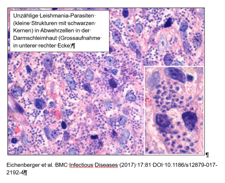 In gewissen Gebieten der Welt können Leishmanien auch zu einer Vermehrung in Abwehrzellen im Blut führen, was mit der Zeit zu einem Abfall aller wichtigen Zellarten führen (viszerale Leishmaniose) und letztlich unbehandelt tödlich enden kann. In der Schweiz kommen Leishmanien nicht vor – mit der Klimaerwärmung könnte sich allerdings die Sandmücke auch bei uns ausbreiten. Infizierte Menschen in der Schweiz haben die Parasiten bisher immer im Ausland, meist im Mittelmeerraum, erworben. Leishmania-Infektionen gehören zu den «Neglected Tropical Diseases» (NTD), den vernachlässigten Tropenkrankheiten.