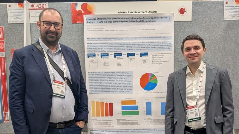 Das prämierte Abstract trägt den Titel „Translational potential in research focused on hematological neoplastic diseases – results of automated large-scale analysis of PubMed and iCite databases“ und wurde von Dr. med. Fabio Dennstädt und Dr. Nikola Cihoric, wissenschaftlichen Mitarbeitenden am Center for AI in Radiation Oncology (CAIRO) der Universitätsklinik für Radio-Onkologie, verfasst. Die Auszeichnung wird im Rahmen des ASH Annual Meetings an ausgewählte Forschungsarbeiten verliehen, die durch besondere wissenschaftliche Qualität und Relevanz hervorstechen.